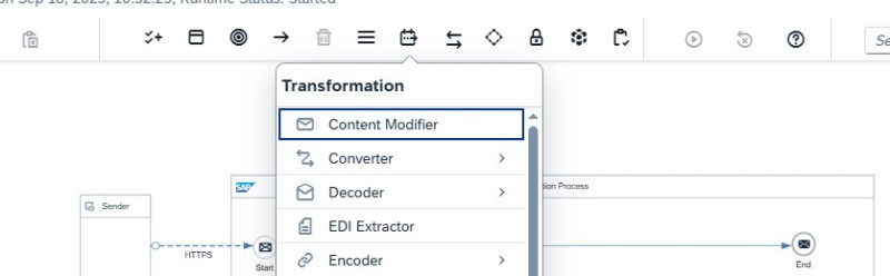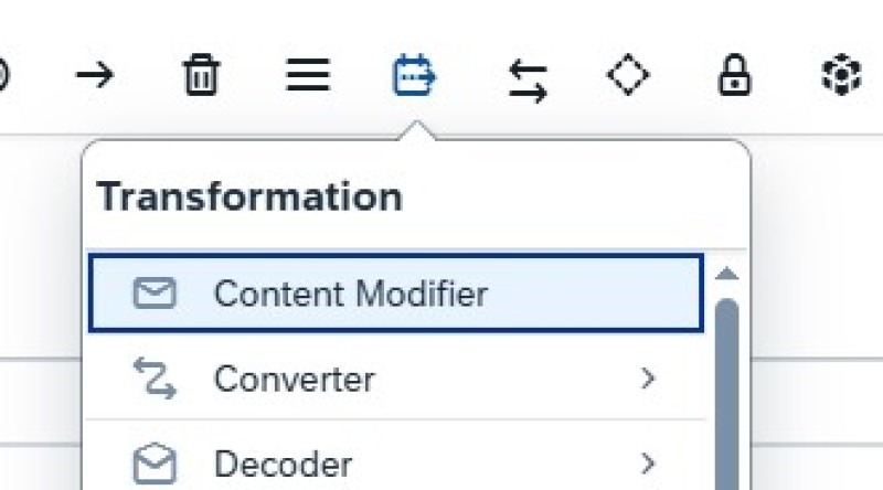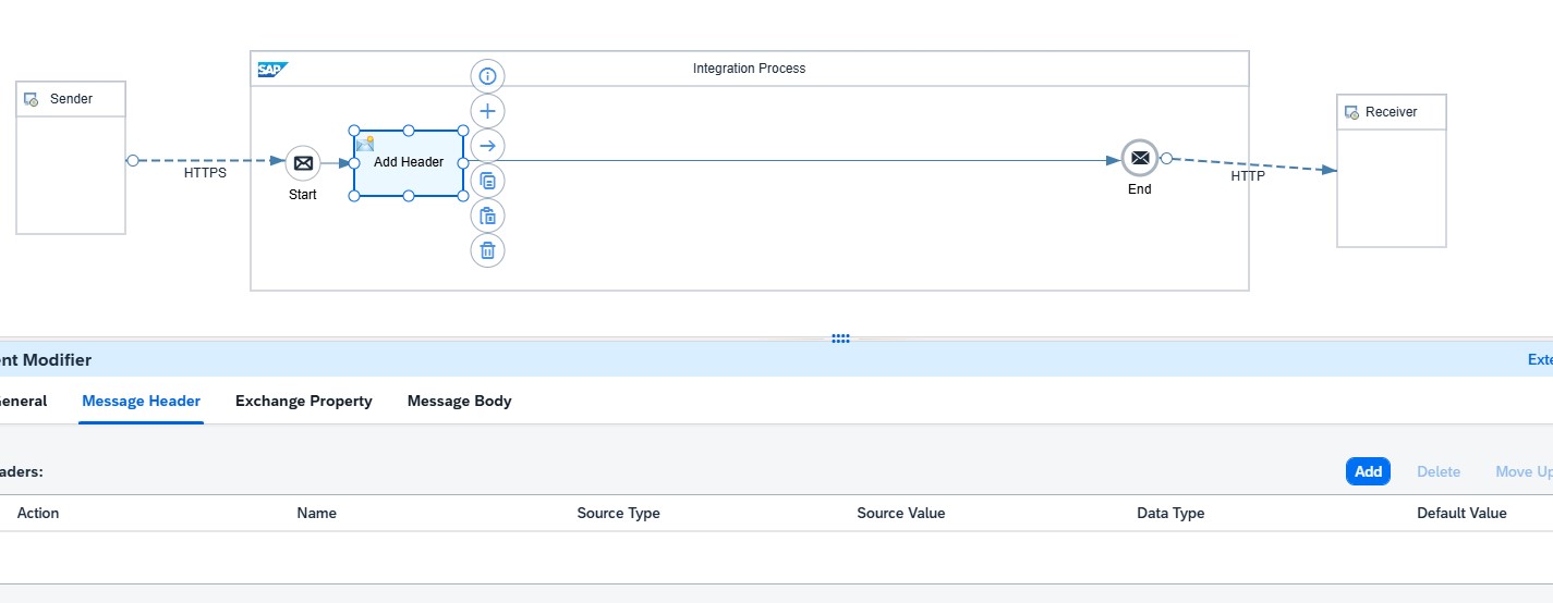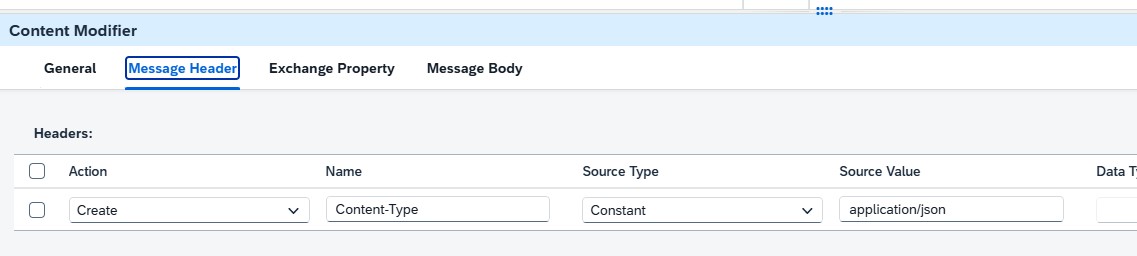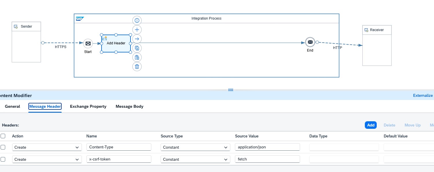 Als Nächstes fügen wir einen Content Modifier hinzu und ergänzen im Header zwei Einträge.