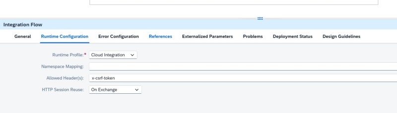 Stellen Sie sicher, dass im Integrationsprozess die Laufzeitkonfiguration für HTTP Session Reuse auf On Exchange eingestellt ist.