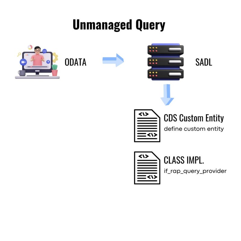Im Gegensatz dazu läuft die Verarbeitung bei einer Managed Custom Query über eine explizite Implementierung. Auch hier startet der Request bei OData und RAP, landet dann jedoch nicht direkt in SADL, sondern im Query-Provider. Dieser ist eine ABAP-Klasse, die das Interface IF_RAP_QUERY_PROVIDER implementiert. Der Entwickler erhält dadurch die volle Kontrolle über den Zugriff: Filter, Paging, Sortierung und Zählung müssen selbst implementiert werden. Statt sich auf eine einzelne CDS-View zu stützen, können beliebige Datenquellen angebunden werden – klassische Tabellen, mehrere CDS-Views, Funktionsbausteine oder sogar externe Services. Autorisierungslogik muss hier eigenständig berücksichtigt werden. Die Flexibilität ist hoch, gleichzeitig steigt aber auch die Verantwortung für korrekte Implementierung und Performance.